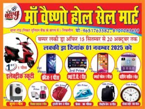 मां वैष्णो होल सेल मार्ट के प्रबंधन अवधेश प्रजापति ने बताया कि लकी ड्रा में सैकड़ों अन्य आकर्षक पुरस्कार भी दिए गए, जिसमें  1नवम्बर को  लक्की ड्रा में – इलेक्ट्रिक स्कूटी, (1 पीस) फ्रीज, (1पीस) टीवी, (1पीस)एंड्रॉयड फोन,(1पीस)वाशिंग मशीन,(1पीस) कूलर,(1पीस) मिक्सर ग्राइंडर मशीन,(1पीस) ट्राली बैग,(3पिस) प्रेस, (10पिस)लैपटॉप बैग,(10पिस) दीवाल घड़ी(100पिस) जैसे आकर्षक उपहार ! जैसे कई उपयोगी उपहार शामिल थे। प्रबंधन ने सभी ग्राहकों को उनके निरंतर समर्थन के लिए धन्यवाद दिया और भविष्य में भी ऐसे ही आकर्षक ऑफ़र लाने का वादा किया। उन्होंने यह भी बताया कि, वो अगले साल इस तरह की चमचमाती 3 स्कूटी लकी ड्रा पुरस्कार में रखेंगे।